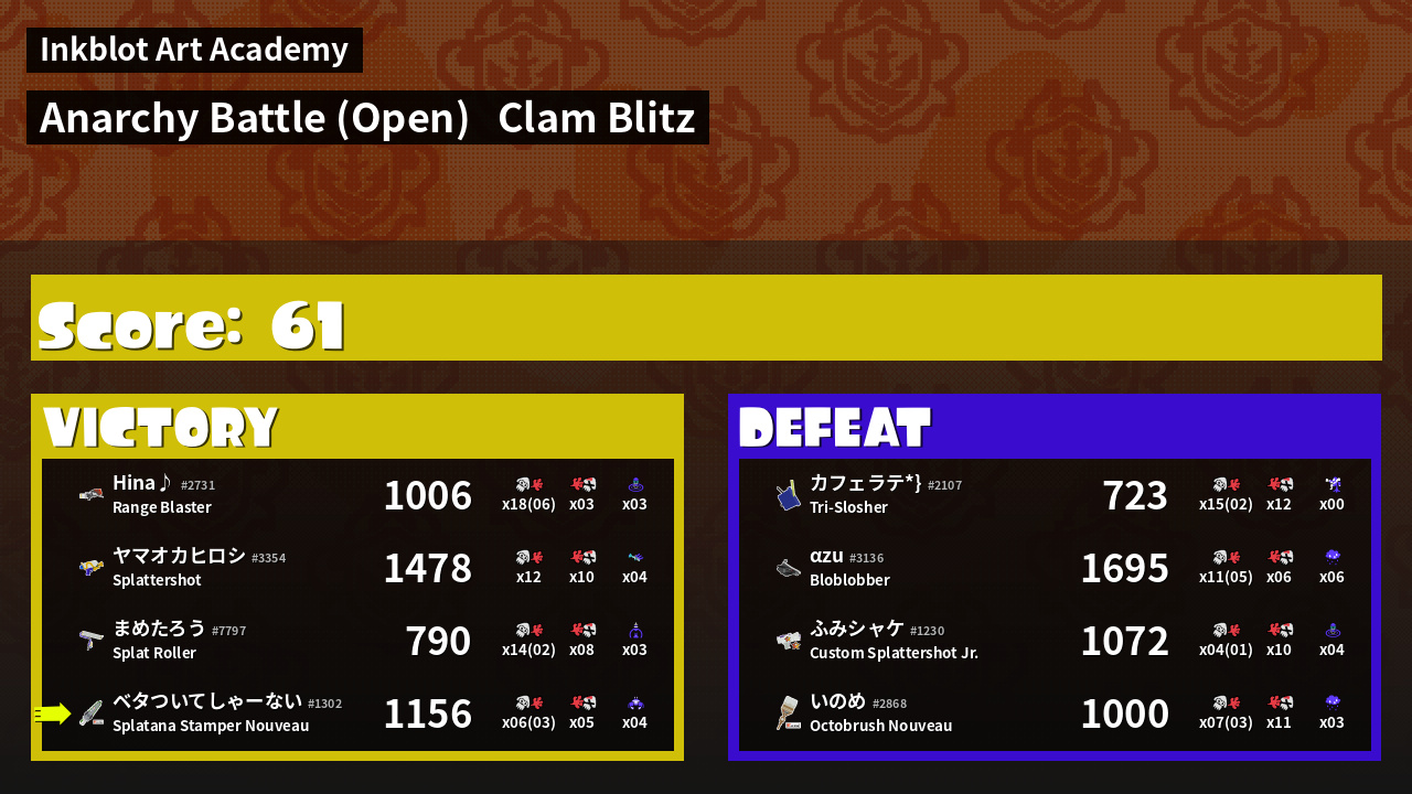 | Mode | Clam Blitz - Anarchy Battle (Open) | ||