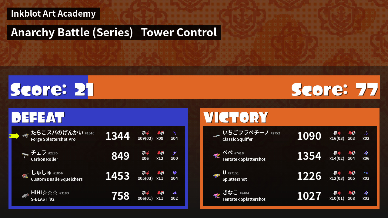 | Medals | #1 Overall Splatter #1 Super Jump Spot #1 Enemy Splatter | ||