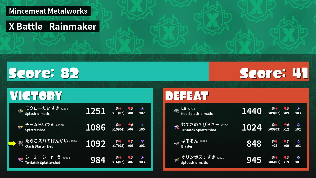 | Medals | #1 Splat Assister #1 Ground Traveler #1 Damage Taker | ||