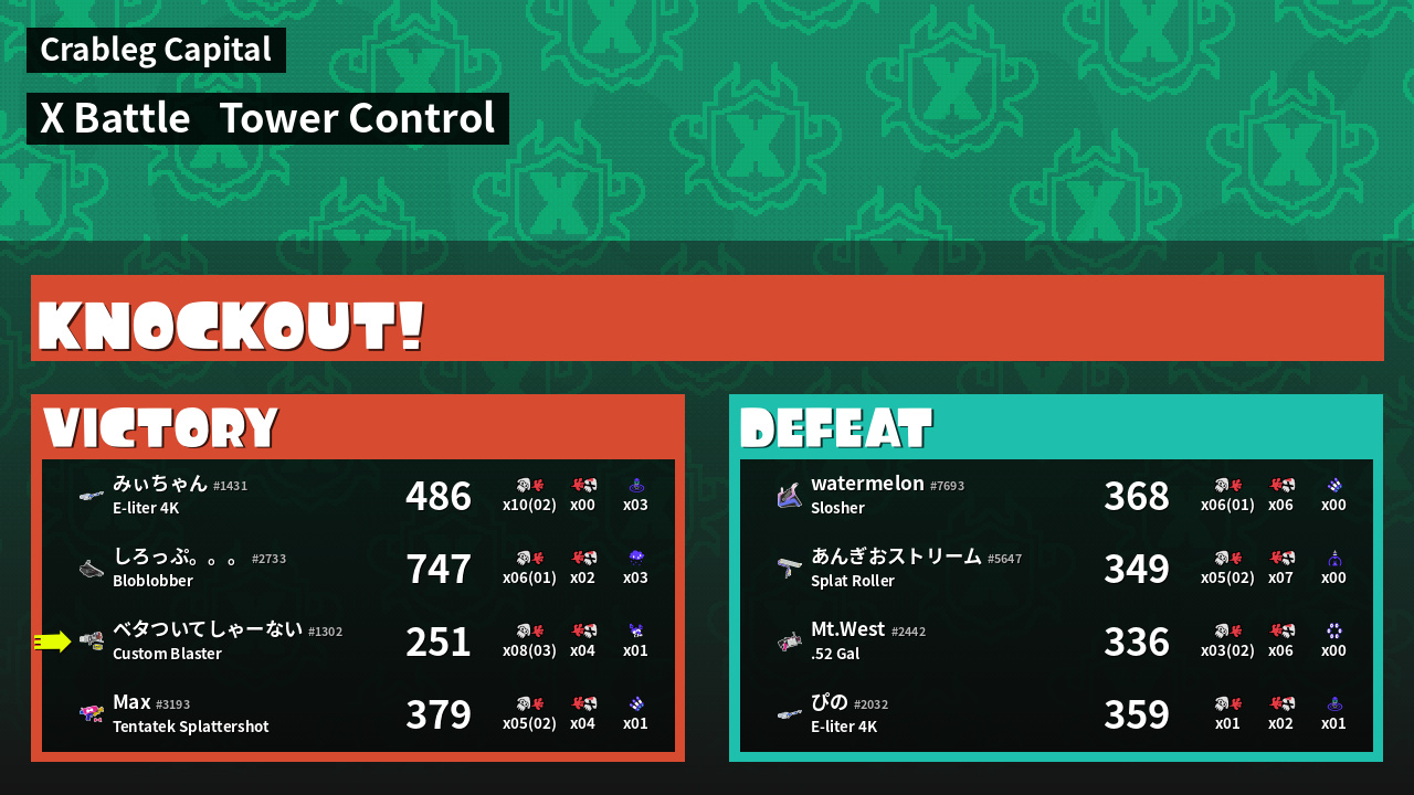 | Medals | #1 Splat Assister #1 Damage Taker #1 Triple Splashdown User | ||