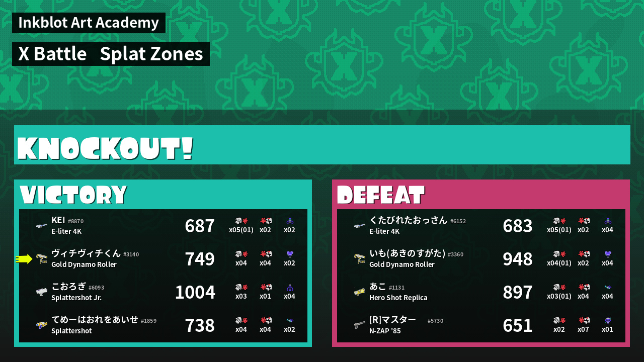 | Medals | #1 Splat Zone Guard #1 Enemy Splatter #1 Splat Zone Hero | ||