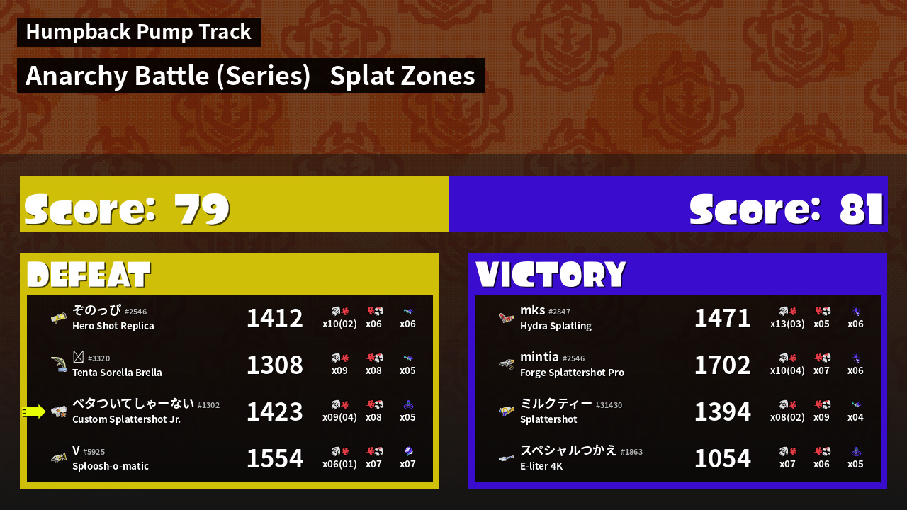 | Medals | #1 Splat Zone Guard #1 Splat Assister #1 Ink Consumer | ||