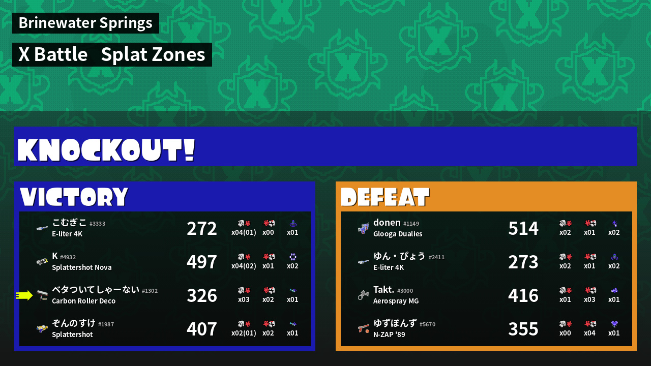 | Medals | #1 Splat Zone Guard #1 Enemy Splatter #1 Ground Traveler | ||