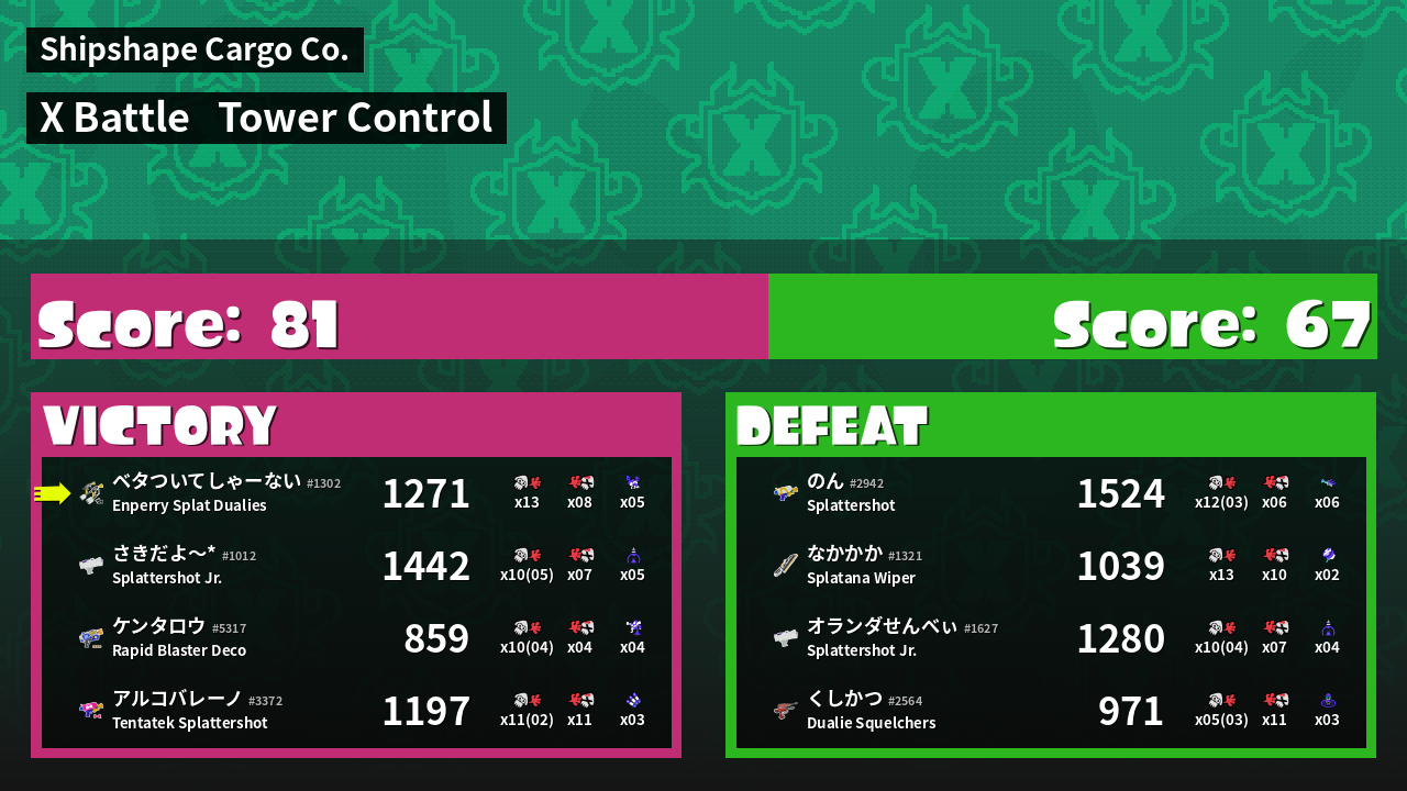 | Weapon | Enperry Splat Dualies ( Curling Bomb / Triple Splashdown) | ||
