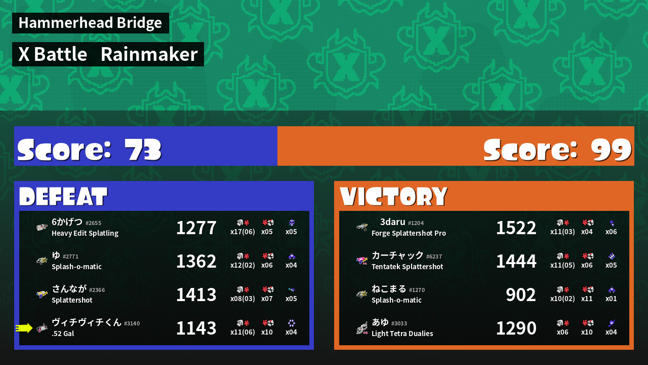 | Medals | #1 Splat Assister #1 Rainmaker Stopper #1 Damage Taker | ||