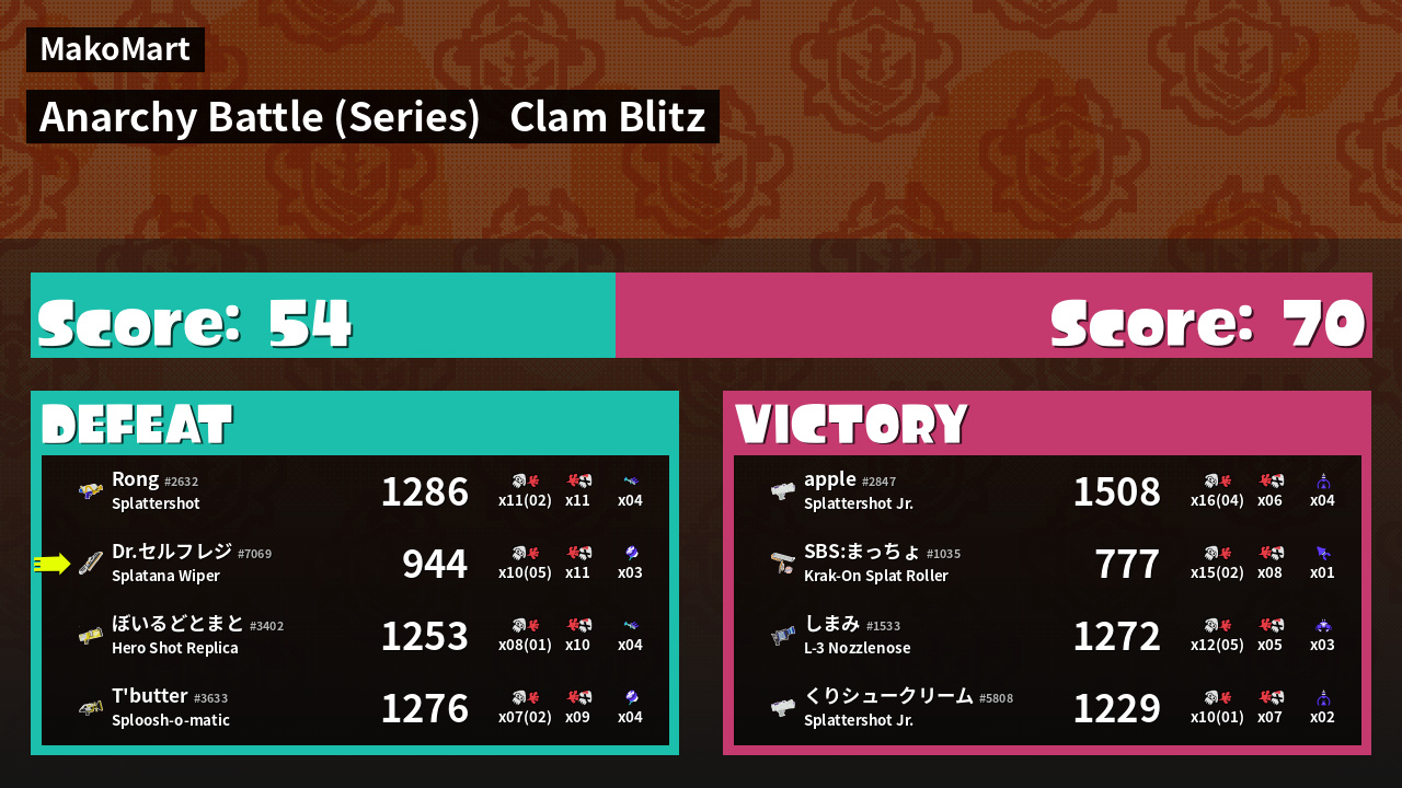| Medals | #1 Splat Assister #1 Clam Stopper #2 Overall Splatter | ||