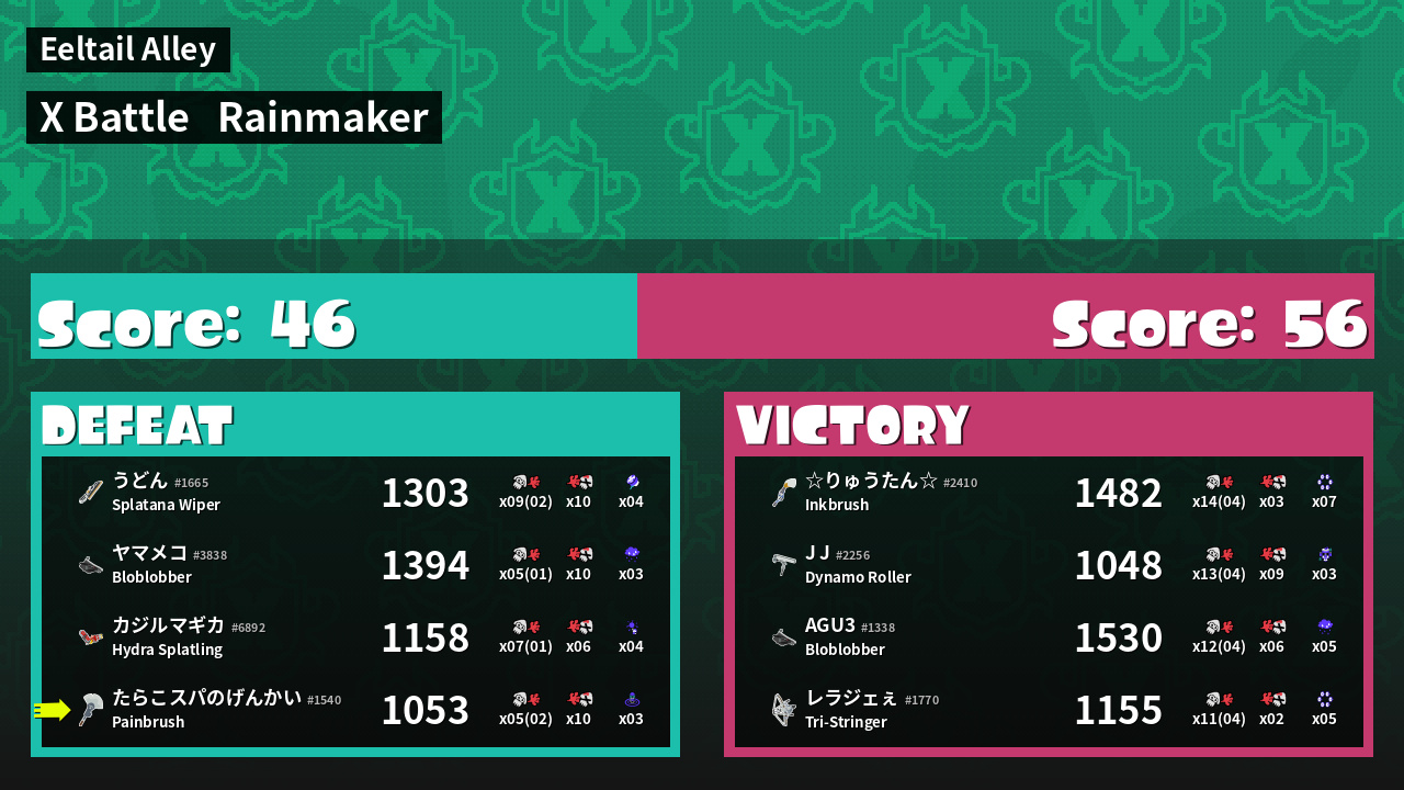 | Medals | #1 Splat Assister #1 Damage Taker #1 Ink Consumer | ||