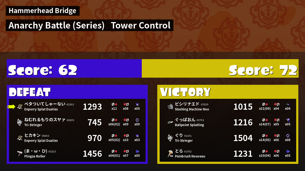 | Weapon | Enperry Splat Dualies ( Curling Bomb / Triple Splashdown) | ||