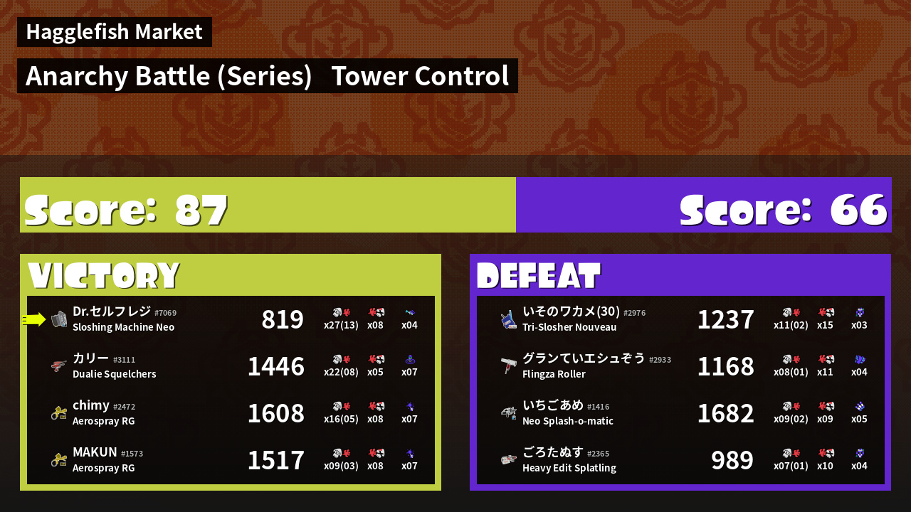 | Medals | #1 Overall Splatter #1 Score Booster Record-Score Setter | ||