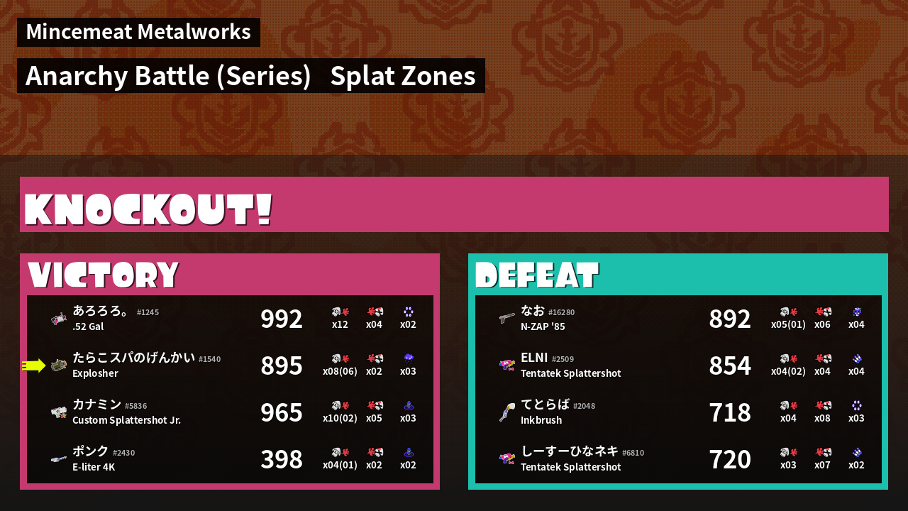 | Medals | #1 Splat Zone Inker #1 Splat Assister #1 Ink Consumer | ||