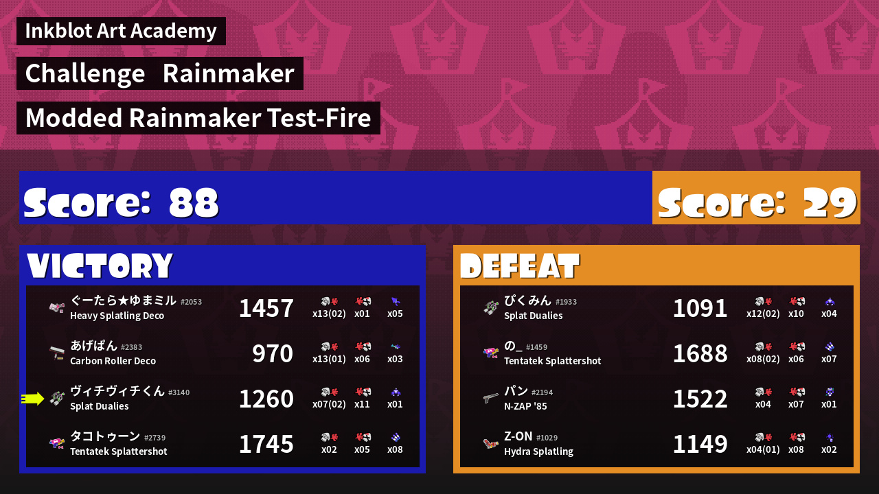 | Medals | #1 Splat Assister #1 Checkpoint Breaker #1 Rainmaker Carrier | ||