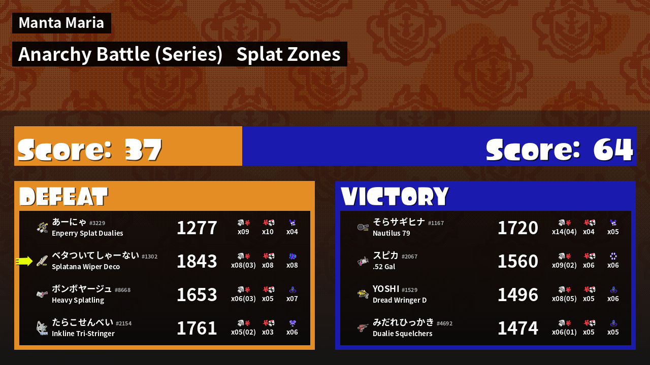 | Medals | #1 Splat Zone Guard #1 Turf Inker #1 Splat Assister | ||