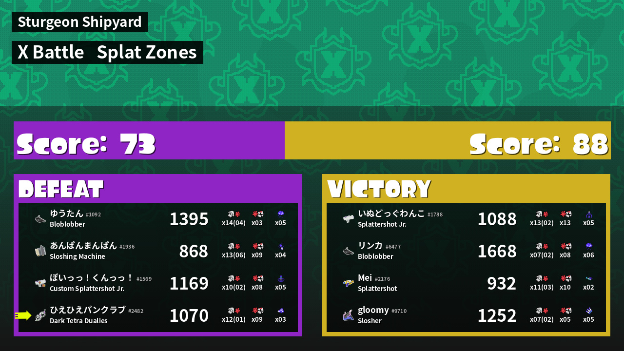 | Medals | #1 Enemy Splatter #1 Ground Traveler First Splat! | ||