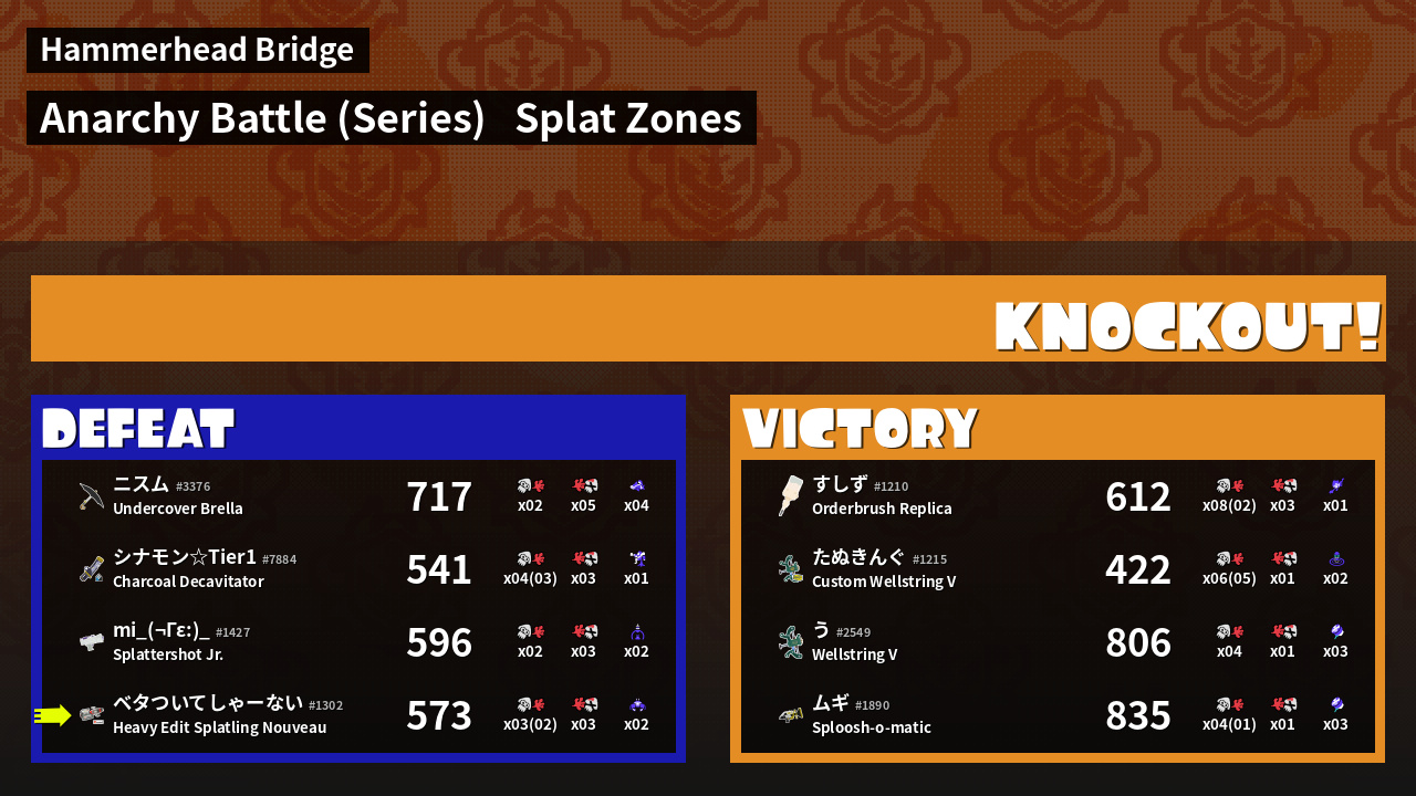 | Medals | #1 Super Jump Spot #2 Overall Splatter #2 Splat Zone Inker | ||
