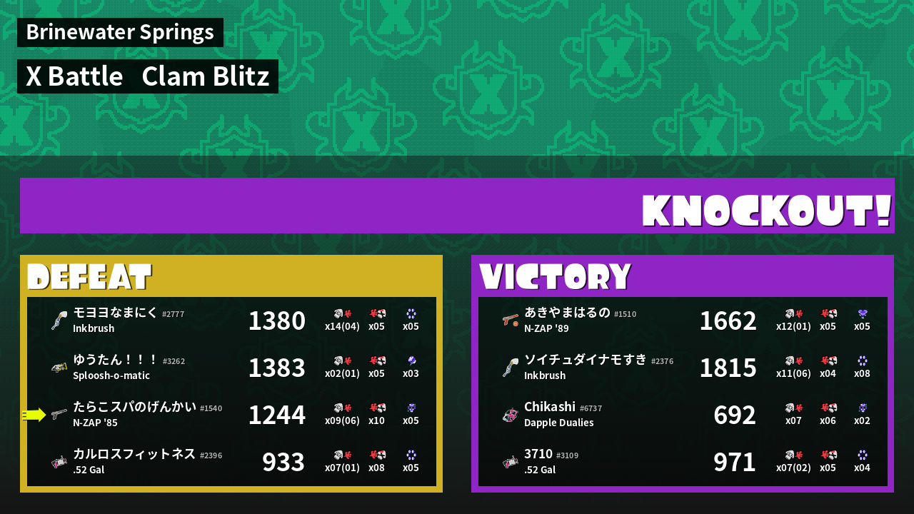 | Medals | #1 Splat Assister #1 Tacticooler User #2 Overall Splatter | ||