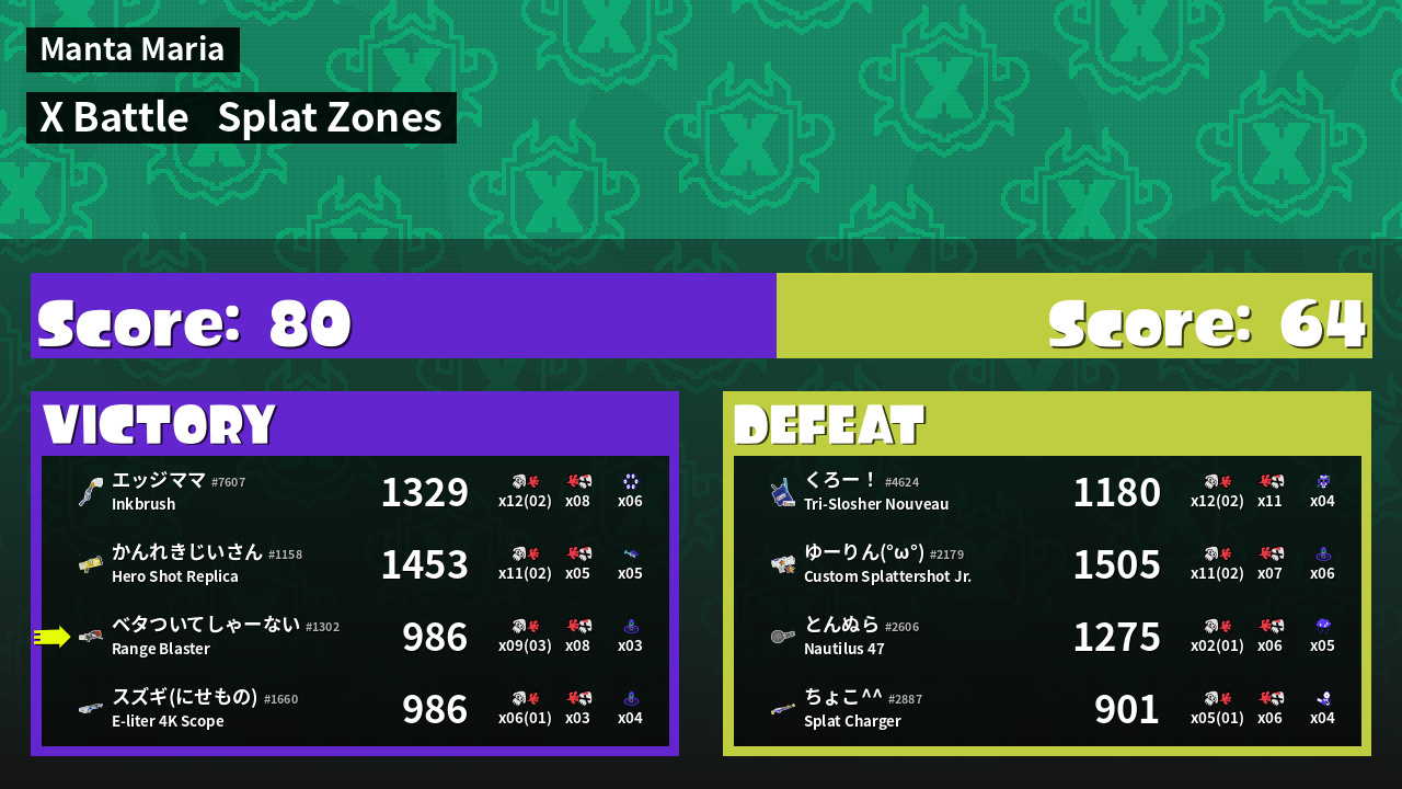 | Medals | #1 Popular Target #1 Splat Assister #1 Wave Breaker User | ||