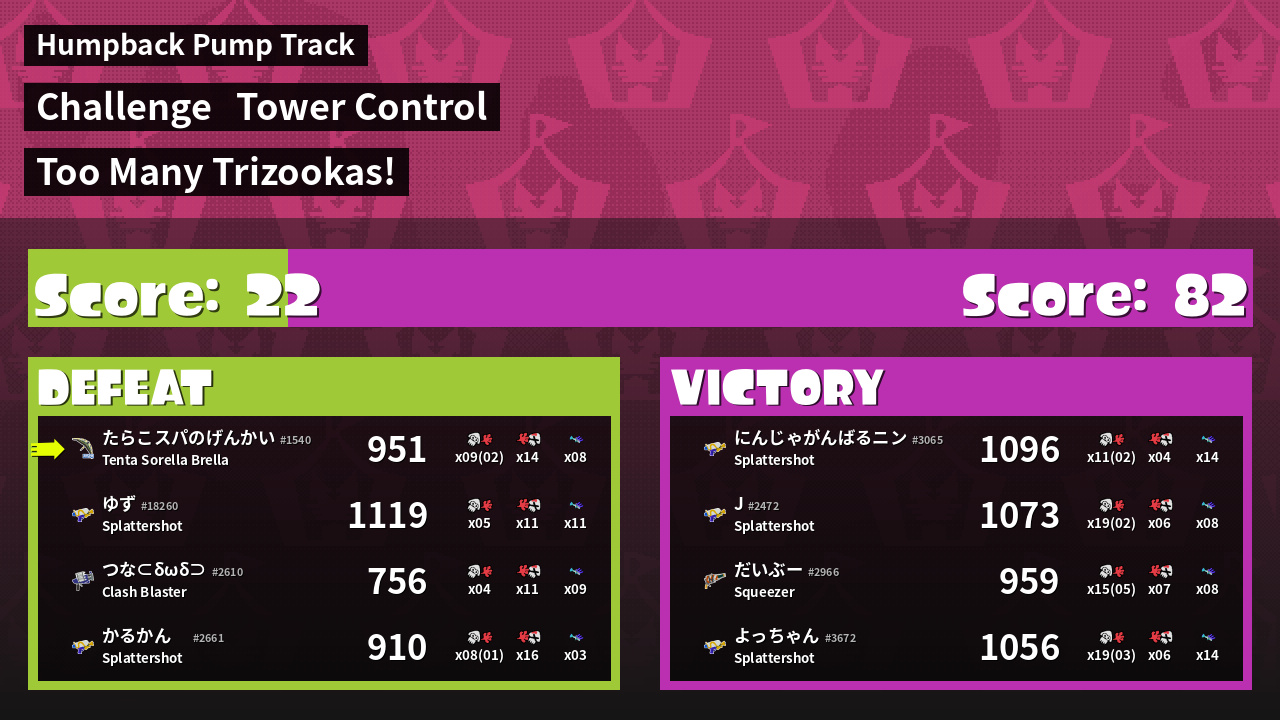 | Medals | #1 Overall Splatter #1 Enemy Splatter #1 Splat Assister | ||
