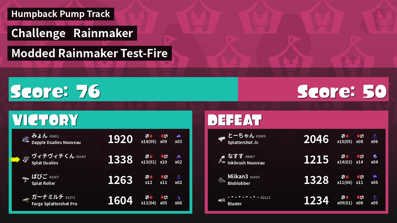 | Medals | #1 Enemy Splatter #1 Rainmaker Stopper #2 Overall Splatter | ||