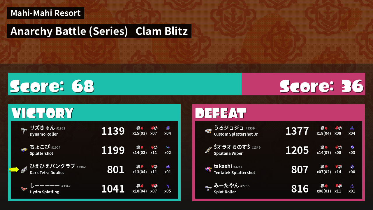 | Medals | #1 Super Jump Spot #1 Splat Assister #1 Clam Stopper | ||