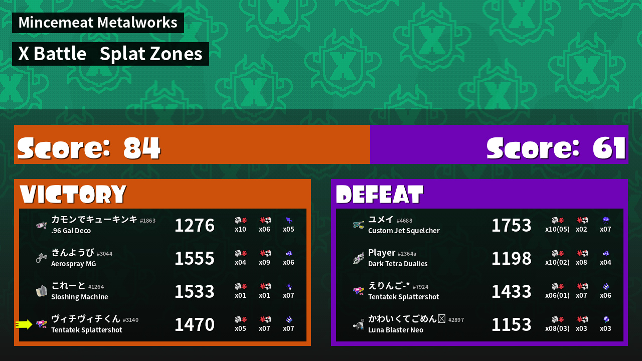 | Medals | #1 Damage Taker #2 Overall Splatter #2 Splat Zone Guard | ||