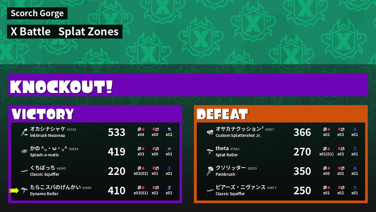 | Medals | #1 Splat Zone Guard #1 Ink Consumer #1 Tacticooler User | ||