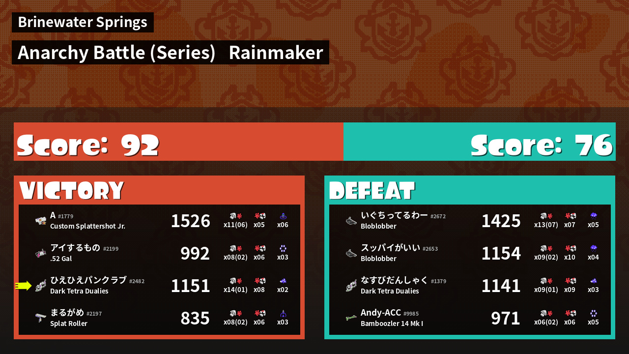 | Medals | #1 Overall Splatter #1 Enemy Splatter #1 Rainmaker Carrier | ||