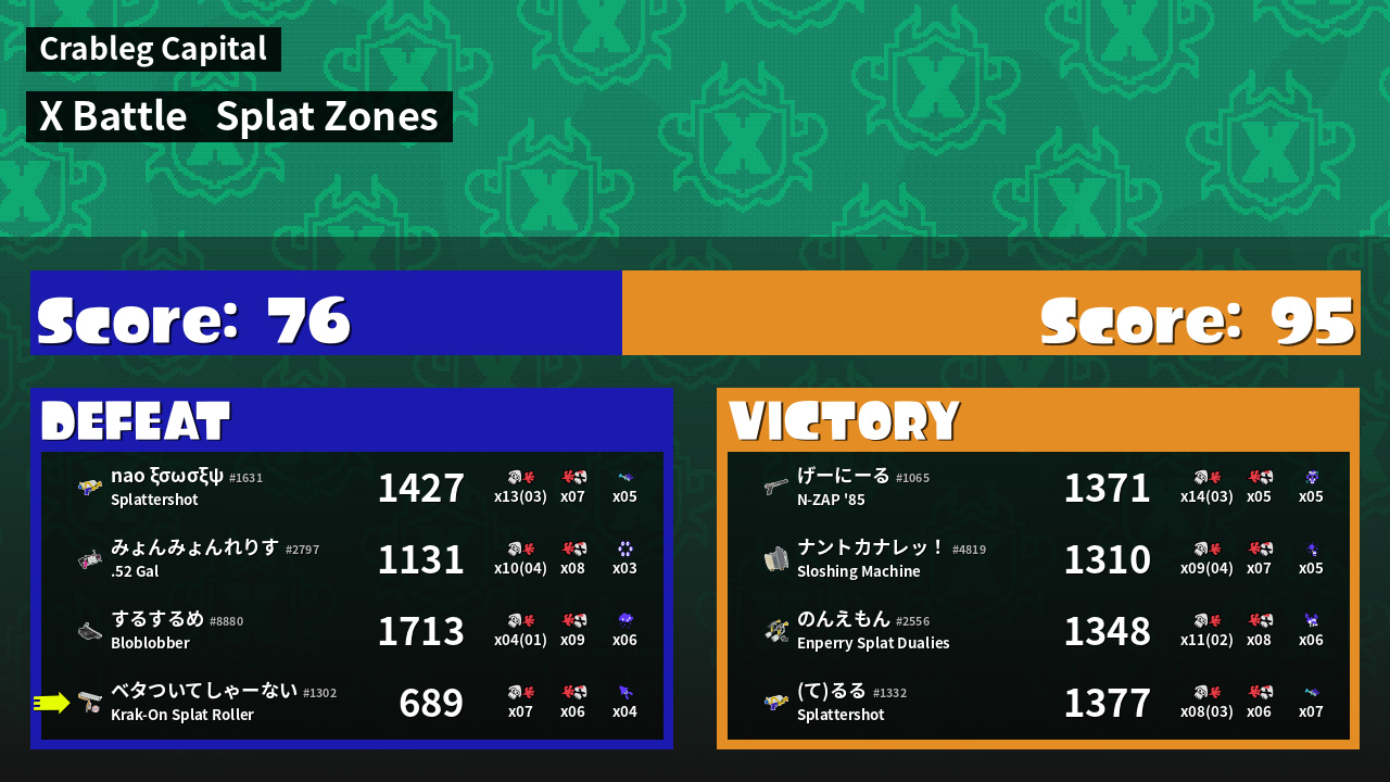 | Medals | #1 Splat Zone Guard #1 Splat Zone Hero #1 Ground Traveler | ||