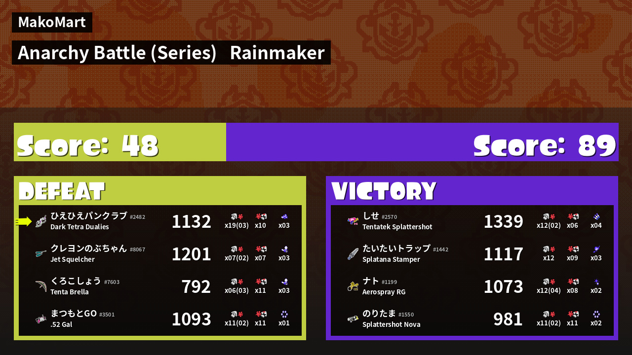 | Medals | #1 Overall Splatter #1 Super Jump Spot #1 Enemy Splatter | ||