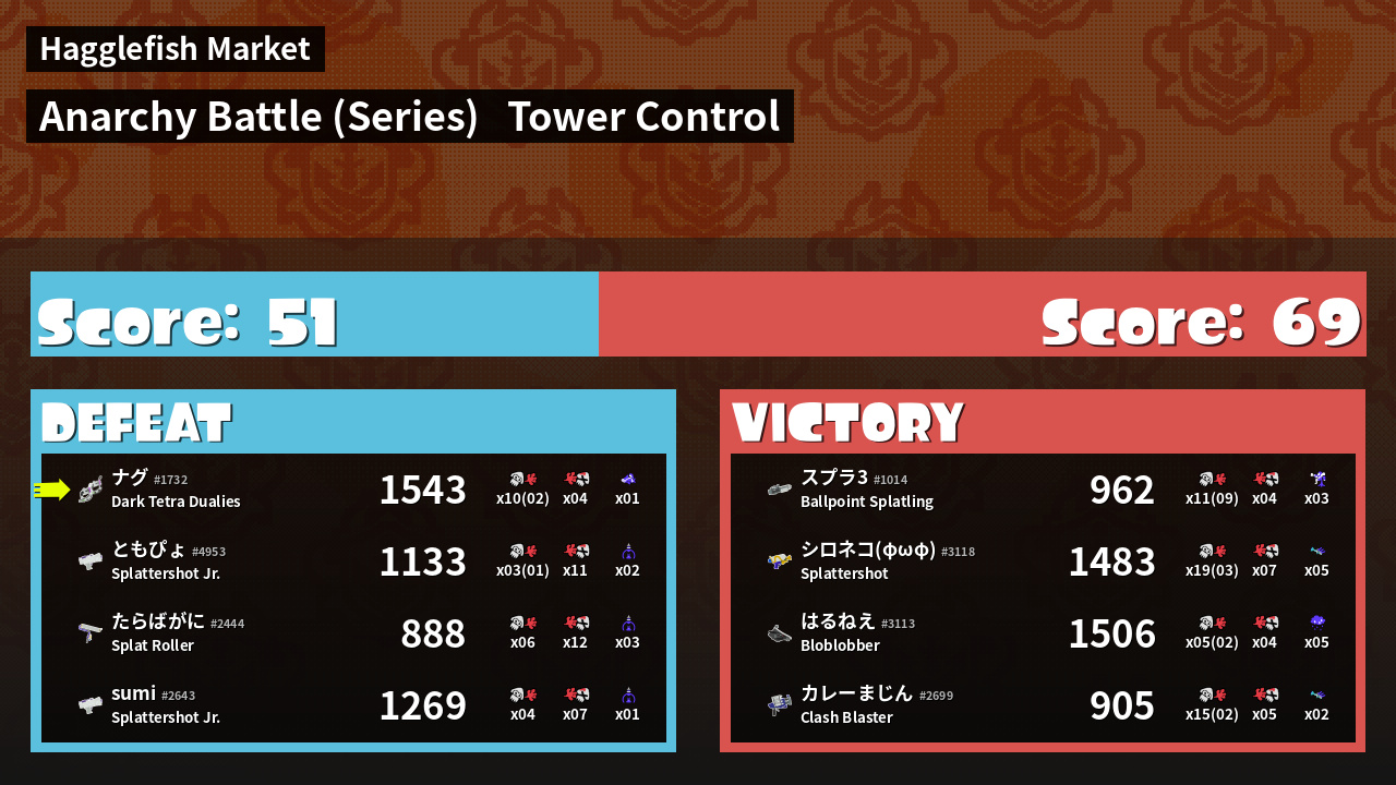 | Medals | #1 Overall Splatter #1 Turf Inker #1 Enemy Splatter | ||