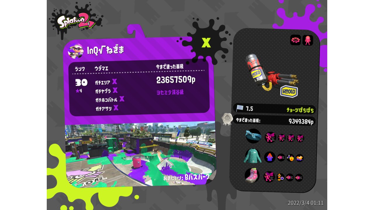 | Weapon | Custom Hydra Splatling ( Ink Mine, Ink Armor) | |||||||||||||||||||||||||||||||||||||
