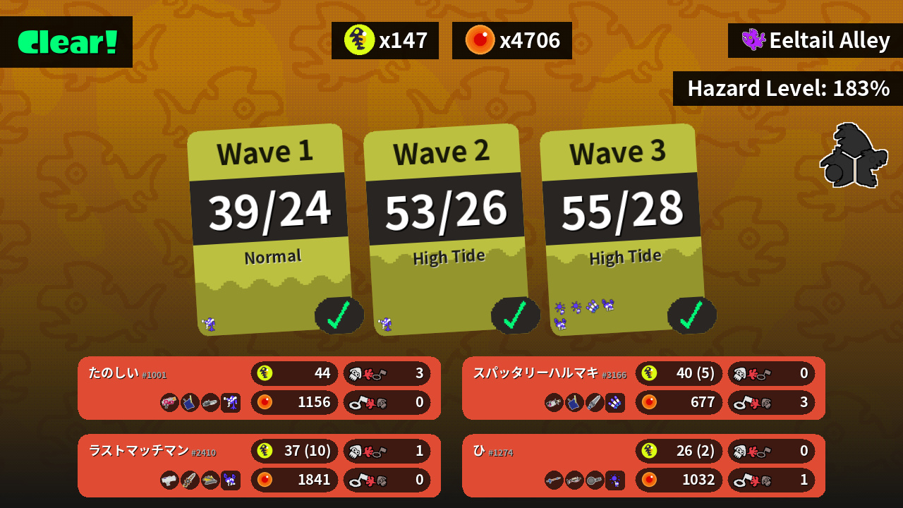 | Weapons | Rapid Blaster Tri-Slosher Ballpoint Splatling | .96 Gal Tri-Slosher Splatana Stamper | Splattershot Jr. Grizzco Splatana Dread Wringer | Snipewriter 5H Grizzco Charger Nautilus 47 |