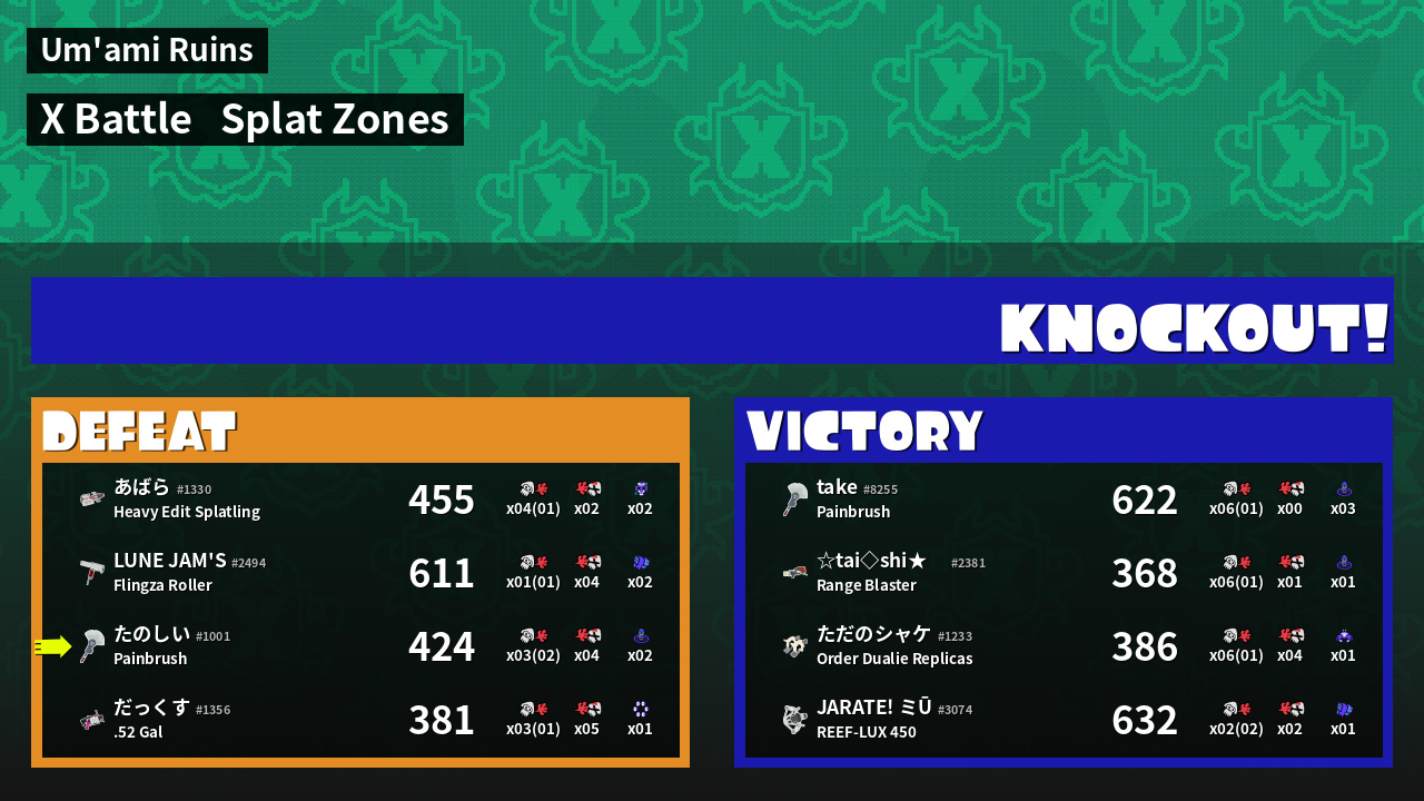 | Medals | #1 Splat Assister #1 Splat Zone Hero #1 Ink Consumer | ||