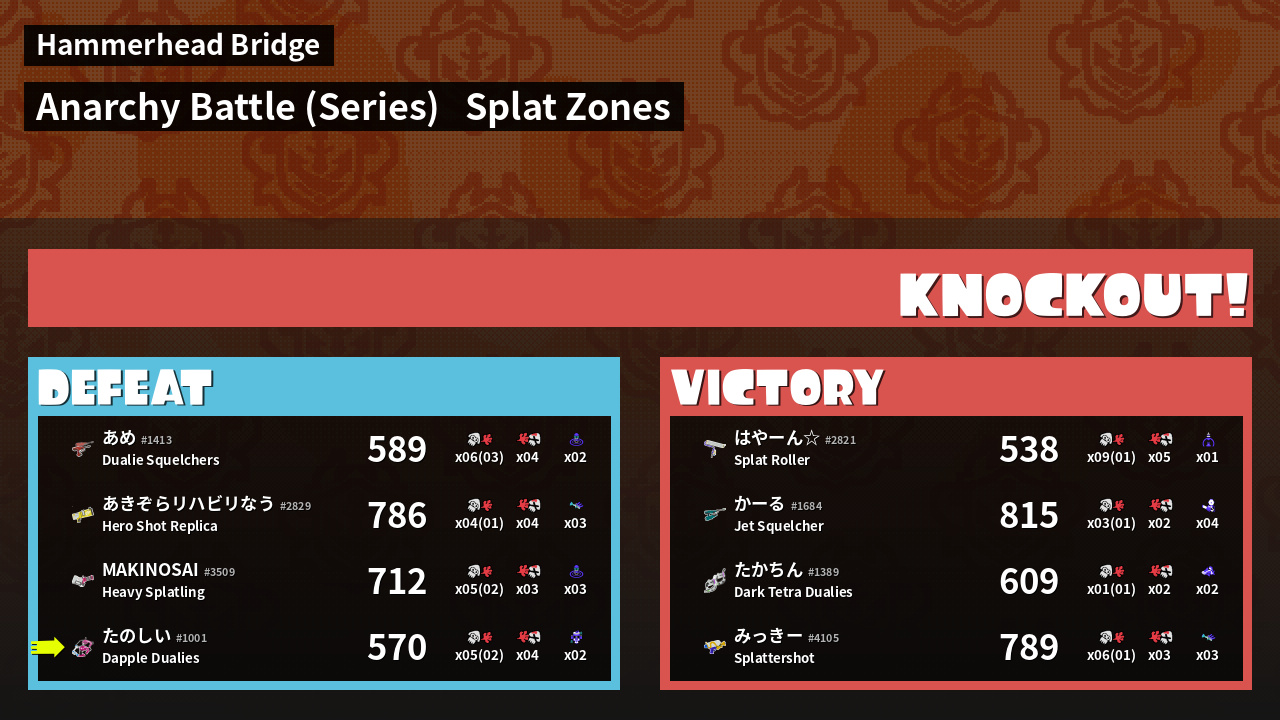 | Medals | #1 Splat Zone Guard #1 Enemy Splatter #1 Splat Zone Hero | ||||