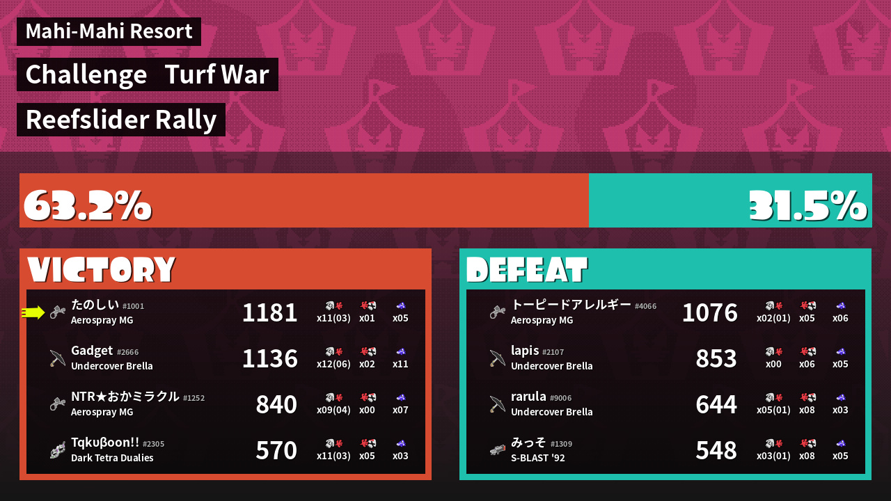 | Medals | #1 Turf Inker #1 Super Jump Spot #1 Enemy Splatter | ||