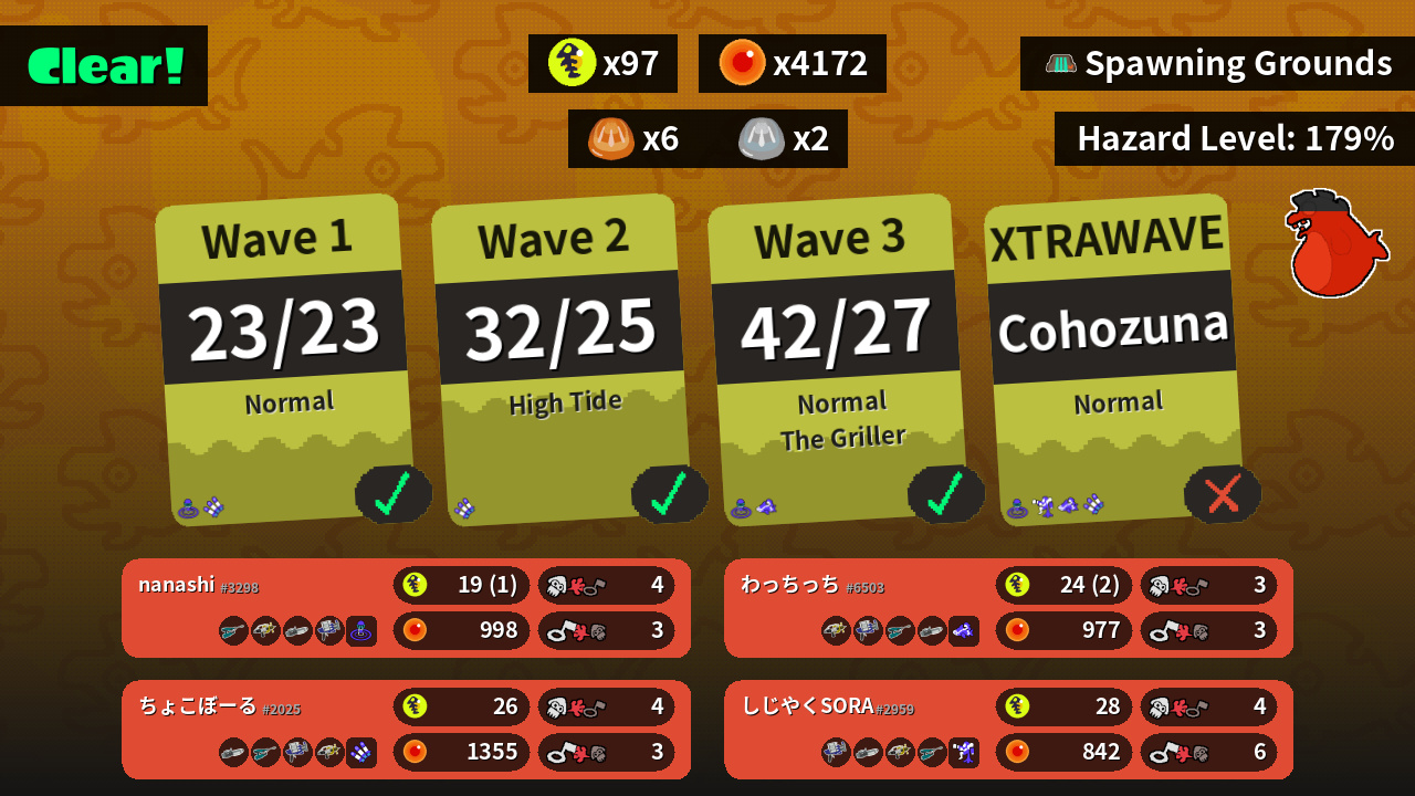 | Weapons | Jet Squelcher Splash-o-matic Ballpoint Splatling Clash Blaster | Clash Blaster Ballpoint Splatling Splash-o-matic Jet Squelcher | Ballpoint Splatling Jet Squelcher Clash Blaster Splash-o-matic | Splash-o-matic Clash Blaster Jet Squelcher Ballpoint Splatling |