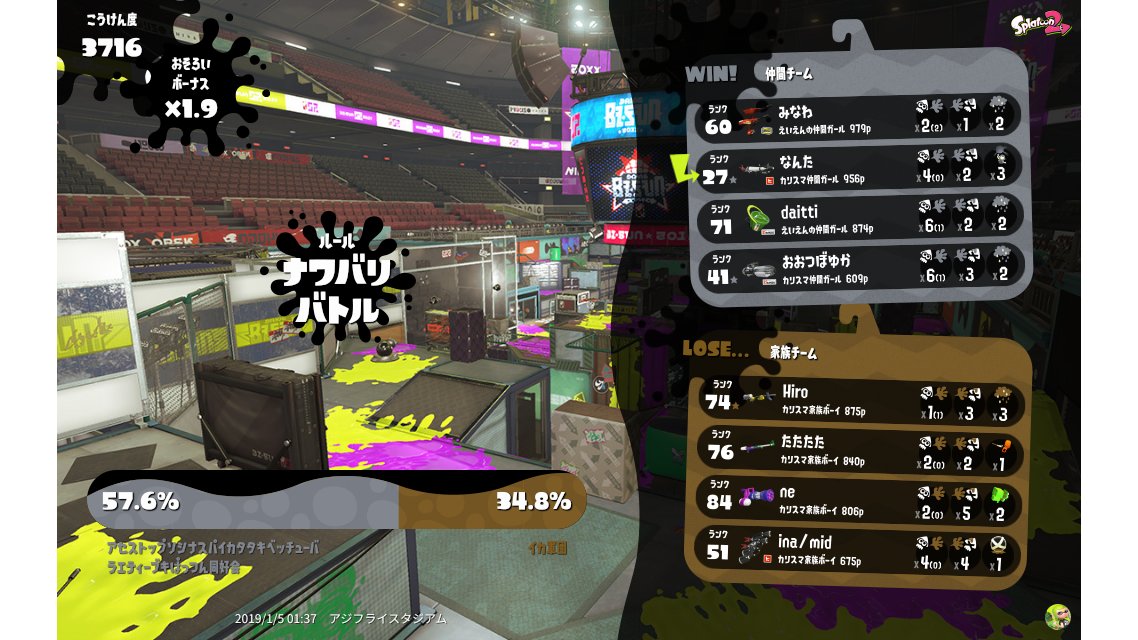 | Team 家族 イカ軍団 Win Streak: 0 | 3,196 | 8 / 14 | 0.57 36.36% | ||||