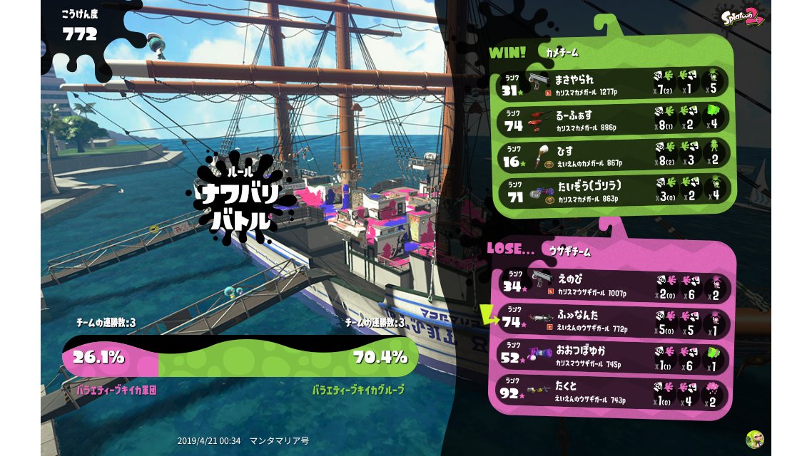 | Team カメ バラエティーブキイカグループ Win Streak: 3 | 3,893 | 21 / 8 | 2.62 72.41% | ||||