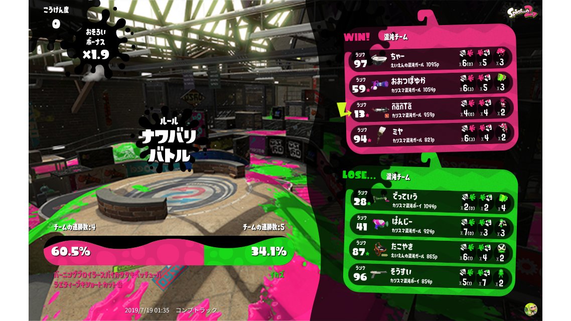 | Team 混沌 イカズ Win Streak: 5 | 3,687 | 18 / 16 | 1.12 52.94% | ||||