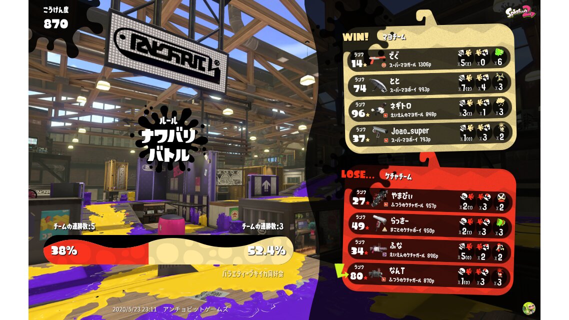| Team マヨ バラエティーブキイカ同好会 Win Streak: 3 | 3,940 | 11 / 8 | 1.38 57.89% | ||||