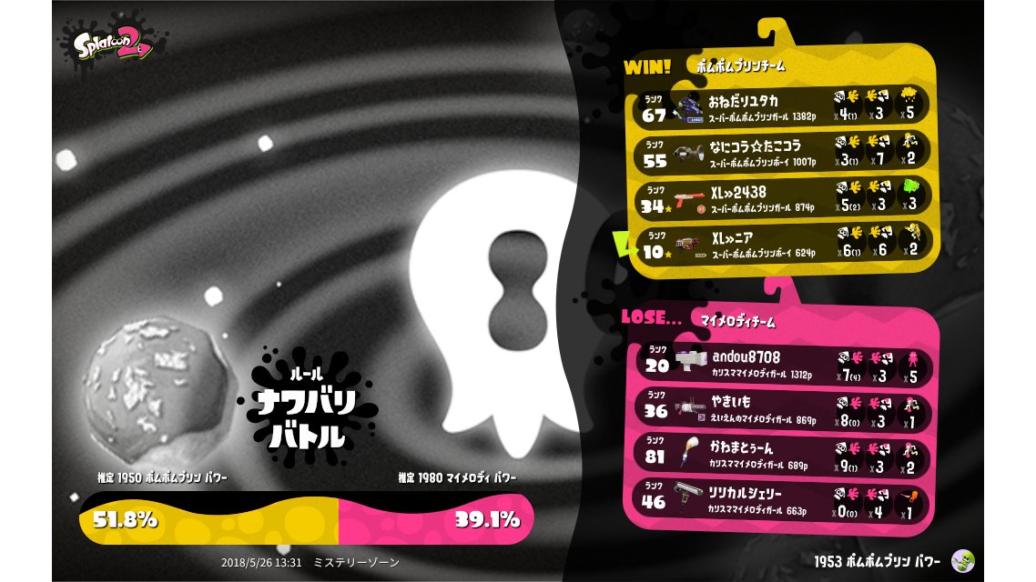 | Splatfest Title | ポムポムプリン Defender 9 → ポムポムプリン Defender 18 | ||||||||||||||||||||||||||||||||||