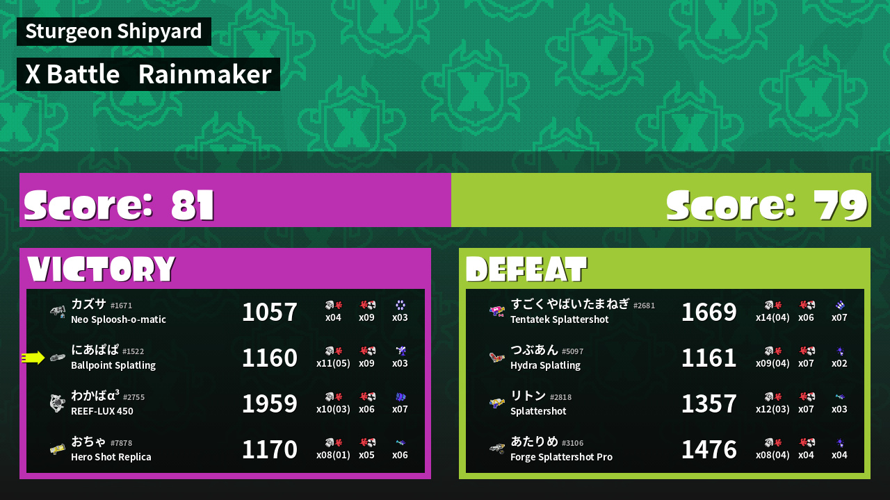 | Medals | #1 Overall Splatter #1 Splat Assister #1 Damage Taker | ||