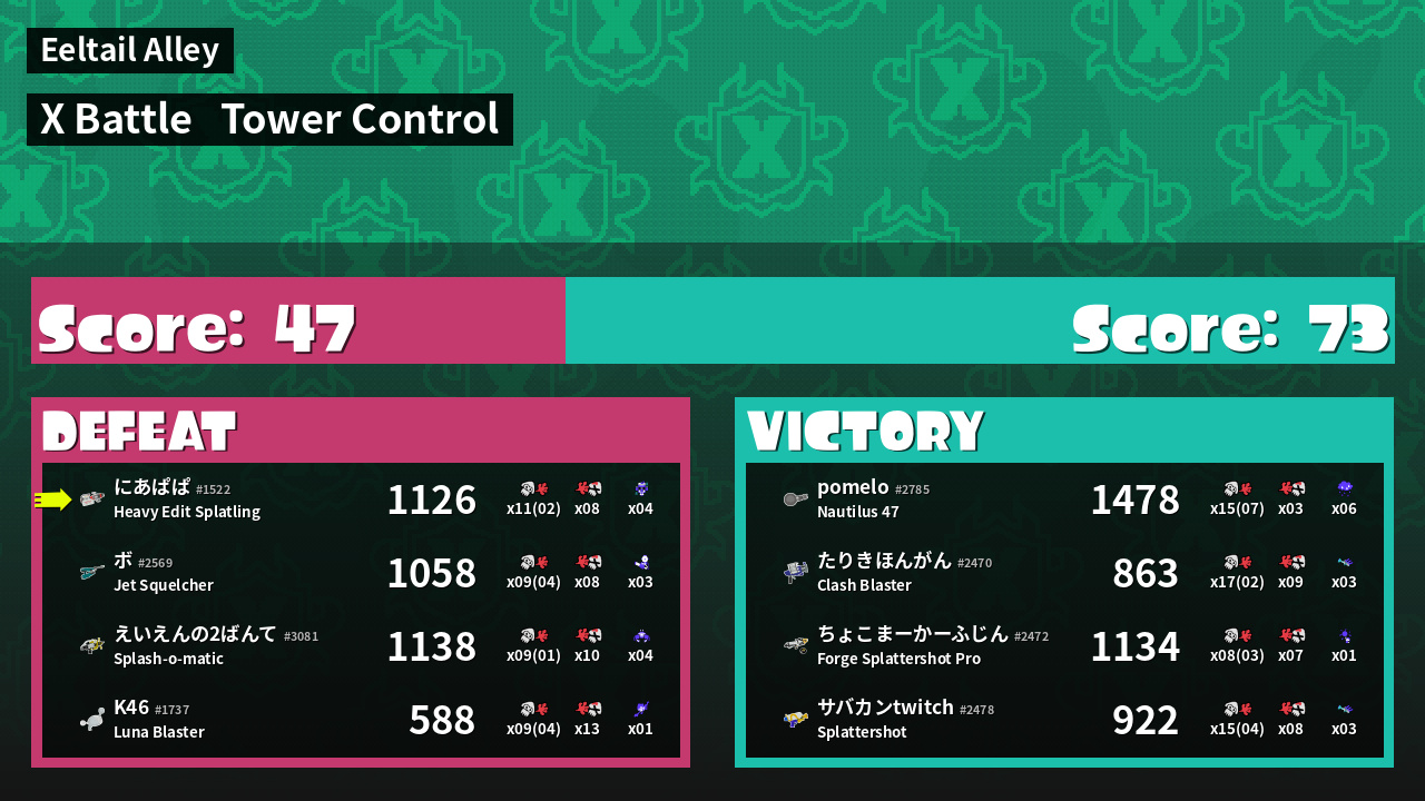| ザトウマーケットのおでん にあぱぱ #1522 |  Heavy Edit Splatling                    | C+ | 1,126 | 9 + 2 | 8 | 1.12 |  4 | |