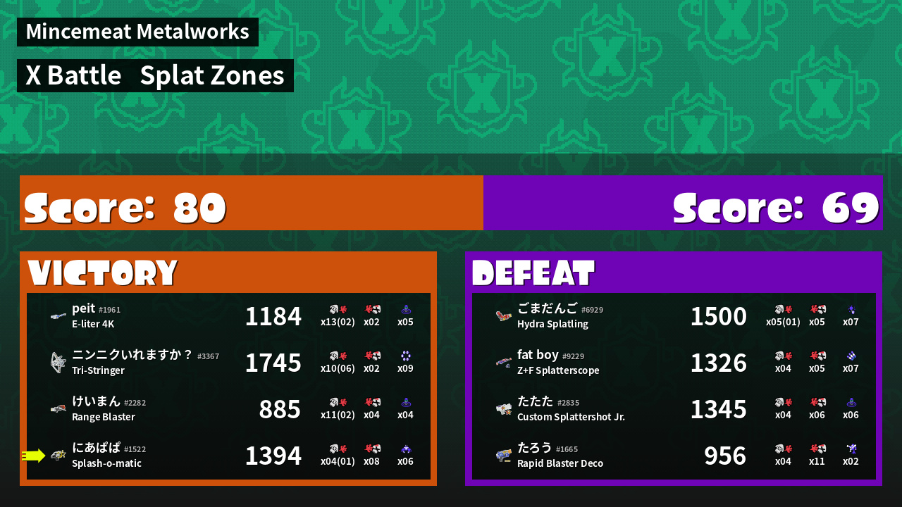 | Medals | #1 Splat Zone Hero #1 Ink Consumer #1 Crab Tank User | ||