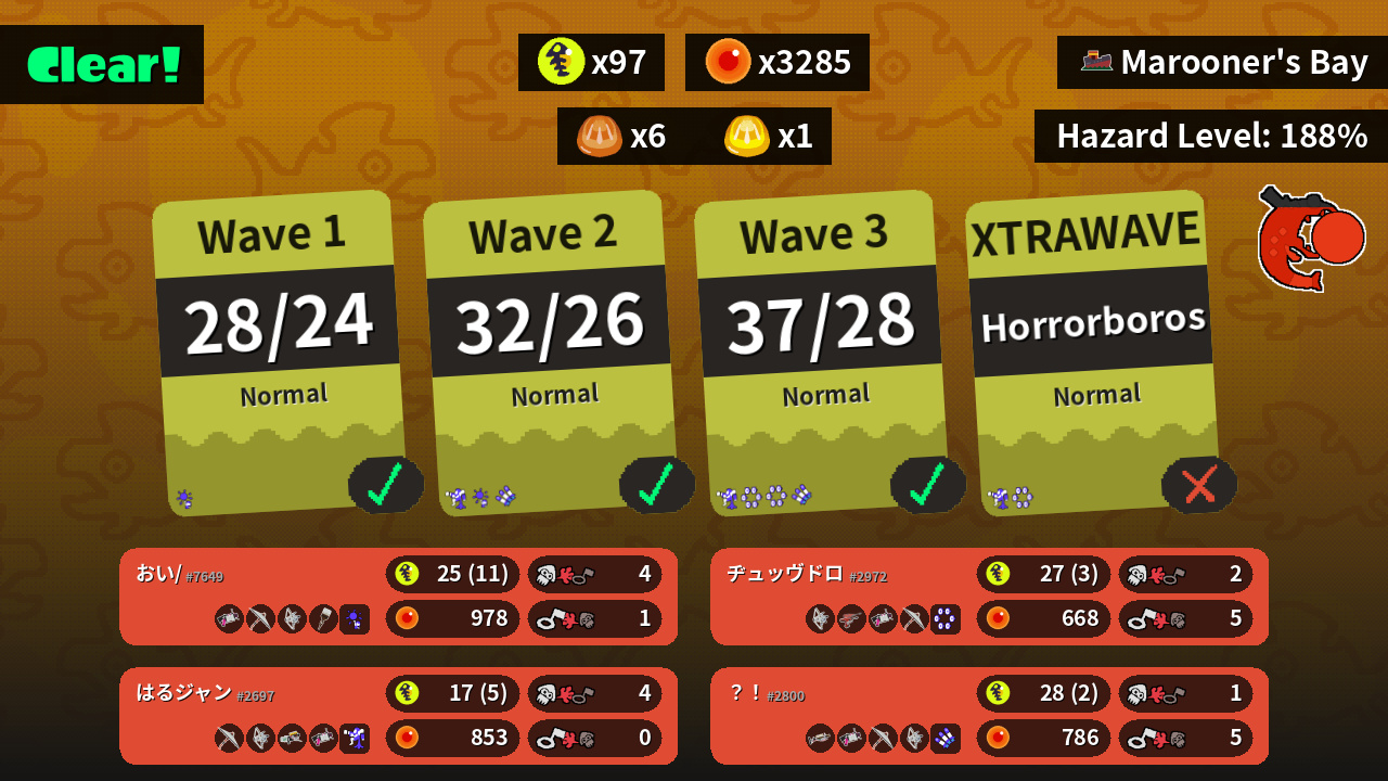 | Weapons | .52 Gal Recycled Brella 24 Mk I Tri-Stringer Octobrush | Grizzco Charger .52 Gal Recycled Brella 24 Mk I Tri-Stringer | Tri-Stringer Dualie Squelchers .52 Gal Recycled Brella 24 Mk I | Recycled Brella 24 Mk I Tri-Stringer Grizzco Blaster .52 Gal |