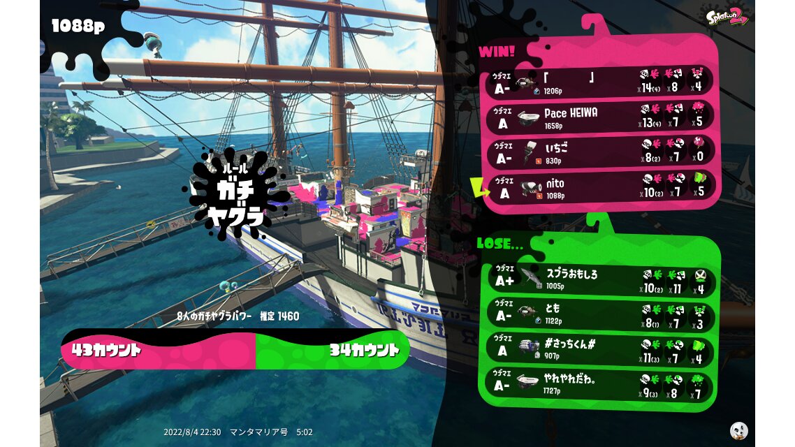 | Name | Weapon | Level | Rank | Inked | k+a/sp | k/d |