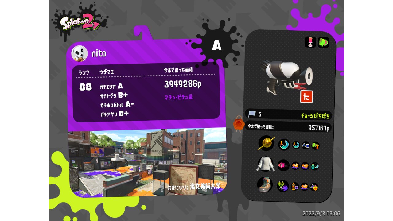 | Name | Weapon | Level | Rank | Inked | k+a/sp | k/d |