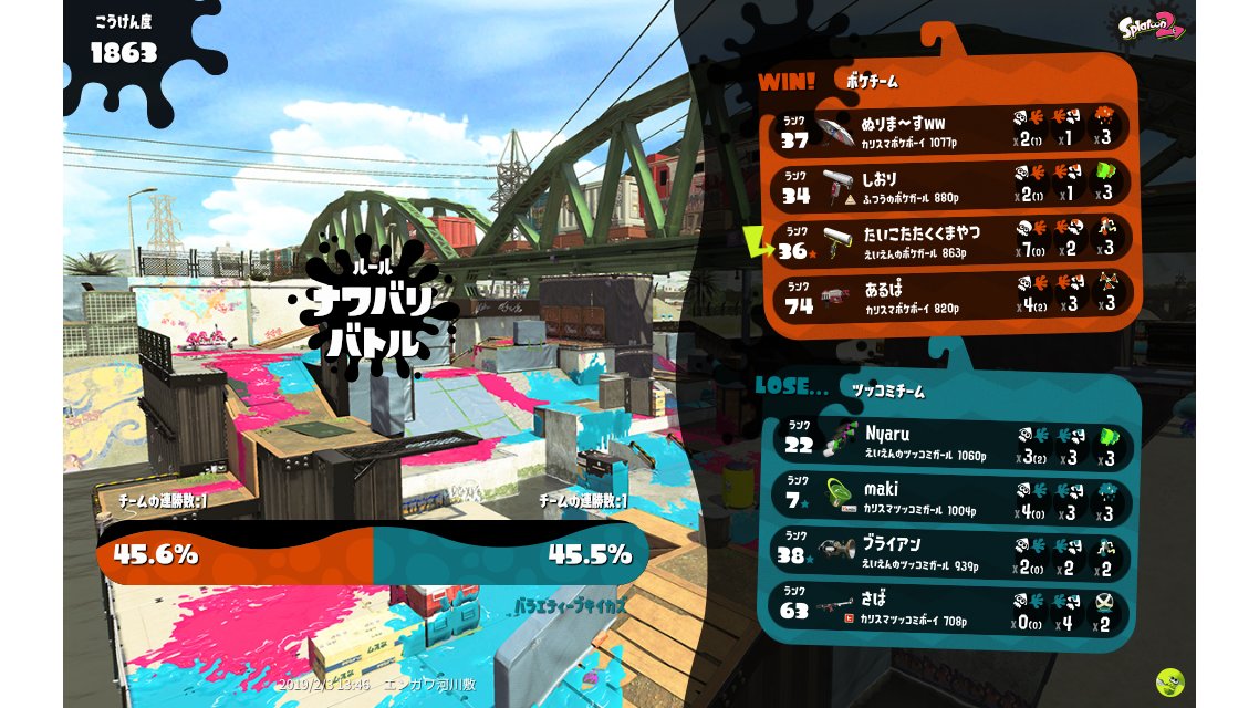 | Team ツッコミ バラエティーブキイカズ Win Streak: 1 | 3,711 | 7 / 12 | 0.58 36.84% | ||||