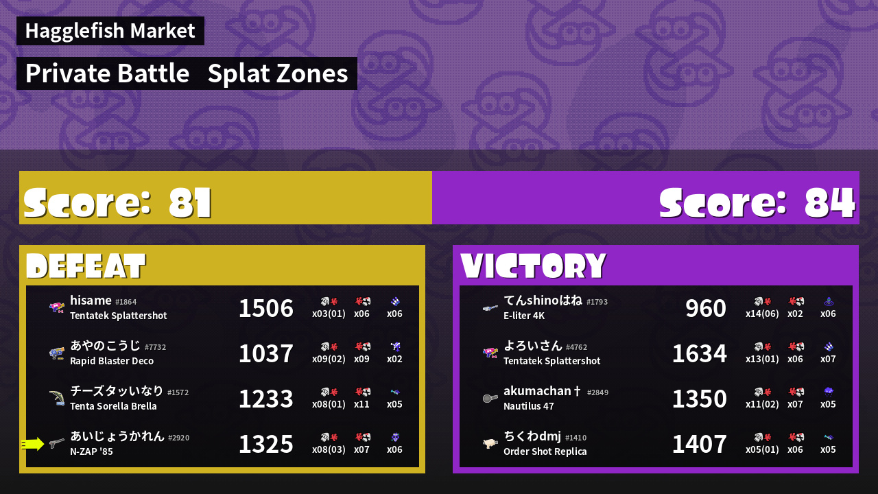 | Medals | #1 Splat Assister #1 Splat Zone Hero #1 Damage Taker | ||