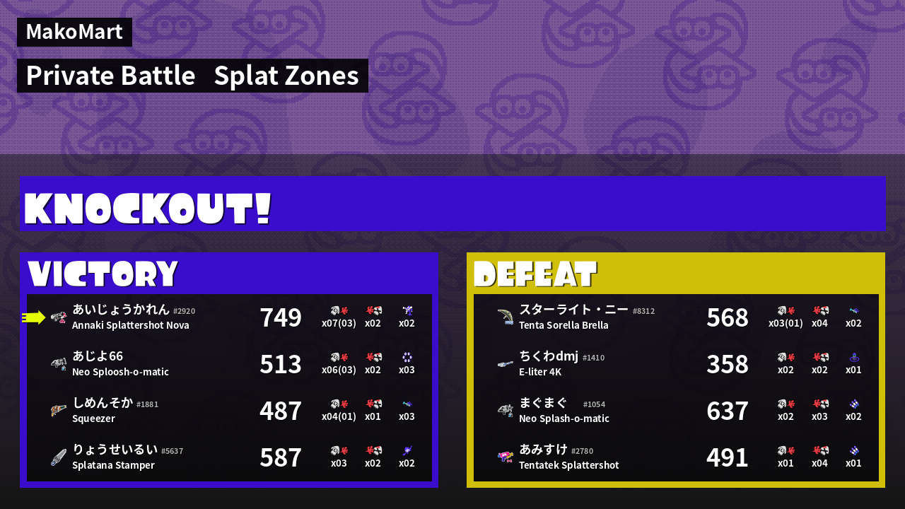 | Mode | Splat Zones - Private Battle | ||