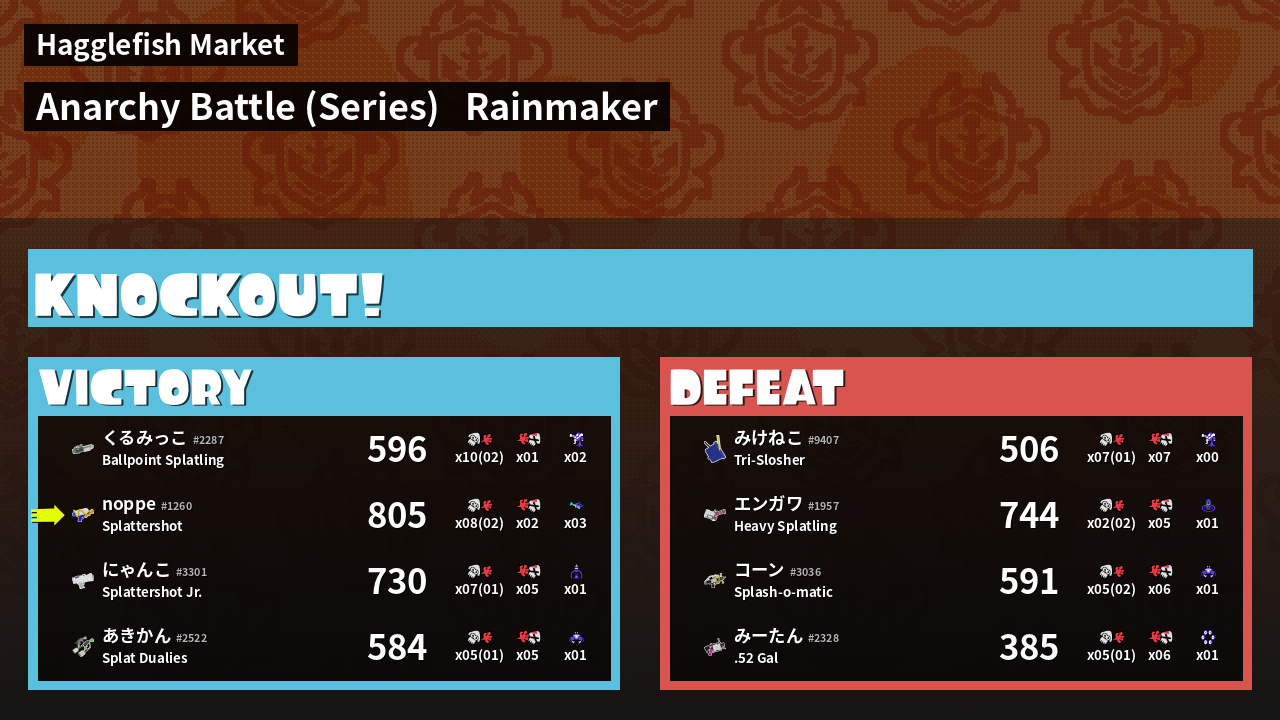 | 明日が楽しみなバレルスピナー使い くるみっこ #2287 |  Ballpoint Splatling                    | 596 | 8 + 2 | 1 | 8.00 |  2 | |